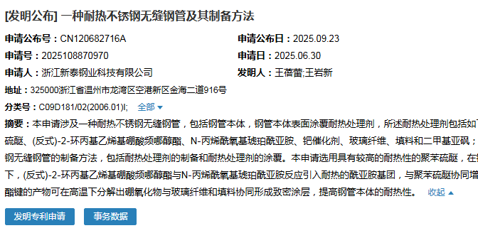 2025年9月23日,浙江新泰鋼業(yè)科技有限公司成功申請一項(xiàng)名為“一種耐熱不銹鋼無縫鋼管及其制備方法”專利,申請公布號為CN120682716A,申請日期為2025年6月30日。