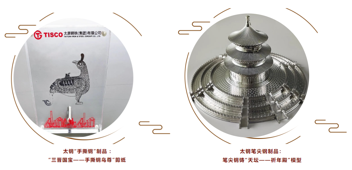 據(jù)了解,此展品分別是太鋼“手撕鋼”制品 ——“三晉國(guó)寶——手撕鋼鳥尊”剪紙,太鋼筆尖鋼制品——筆尖鋼鑄“天壇——祈年殿”模型。