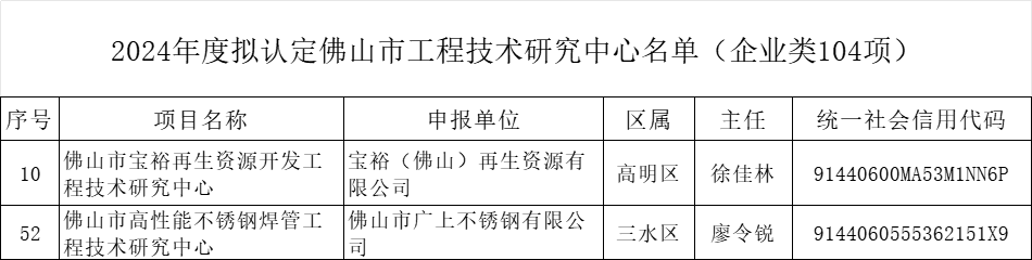 據(jù)名單信息顯示,佛山市寶裕再生資源開發(fā)工程技術(shù)研究中心、佛山市高性能不銹鋼焊管工程技術(shù)研究中心均入選。
