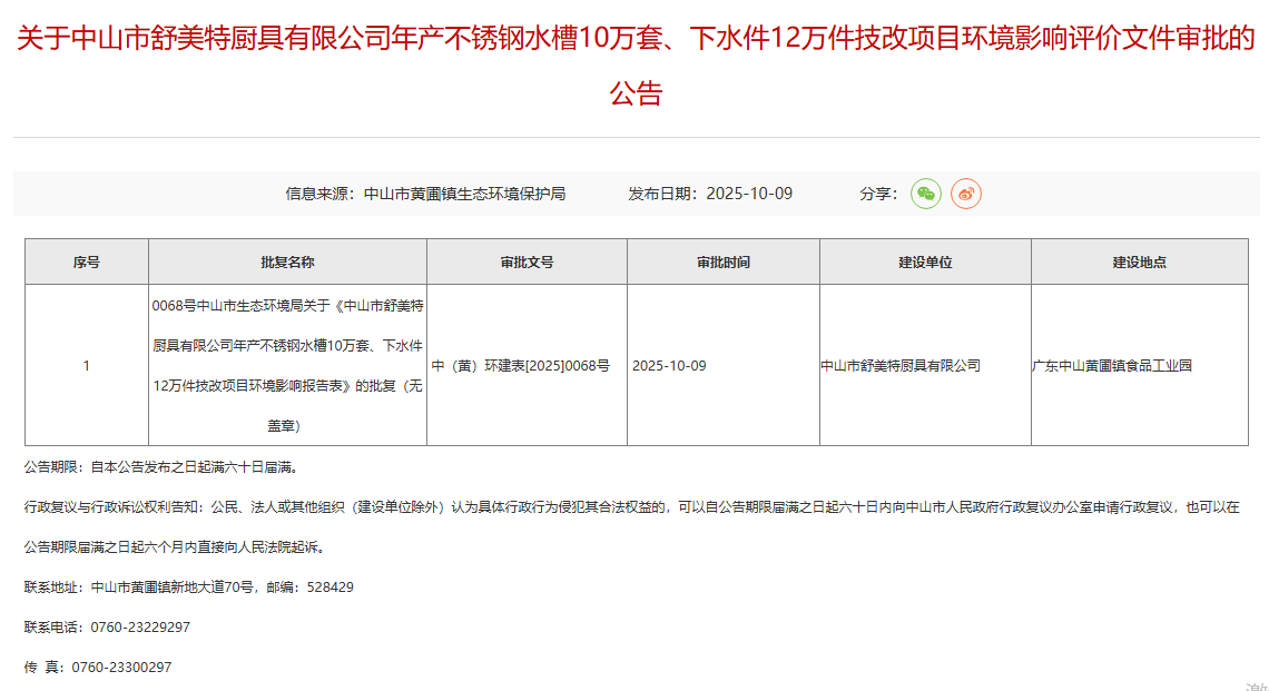 2025年10月9日,中山市黃圃鎮(zhèn)生態(tài)環(huán)境保護局就中山市舒美特廚具有限公司年產(chǎn)不銹鋼水槽10萬套、下水件12萬件技改項目環(huán)境影響評價文件作出審批意見并對外進行公告,公告期限:自本公告發(fā)布之日起滿六十日屆滿。