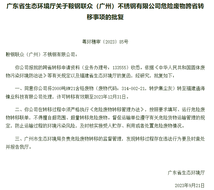 9月21日,廣東省生態(tài)環(huán)境廳就鞍鋼聯(lián)眾(廣州)不銹鋼有限公司危險廢物跨省轉(zhuǎn)移事項作出批復(fù),據(jù)顯示,同意鞍鋼聯(lián)眾將2000噸HW21含鉻廢物(廢物代碼:314-002-21,轉(zhuǎn)爐集塵灰)轉(zhuǎn)至福建通海鎳業(yè)科技有限公司處理,許可轉(zhuǎn)移有效期至2023年12月31日。(來源:廣州市生態(tài)環(huán)境局)